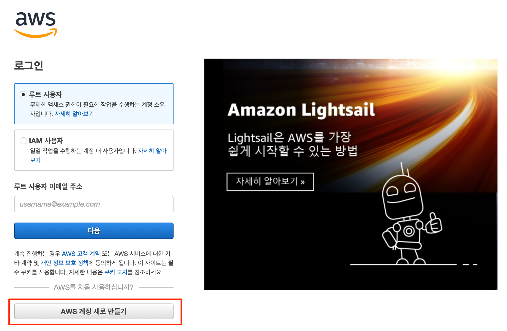 웹 브라우저에 signin.aws.amazone.com 주소를 입력해 이동한 후 아래와 같이 [AWS 계정 새로 만들기] 버튼을 누르고, Account를 생성하는 사용자의 이메일 주소를 넣고 인증한 후에 여러가지 인적사항 등을 기입하여 Account 생성을 완료한다.