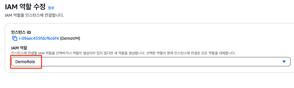 역할을 연결할 VM에서 보안 > IAM 역할 수정을 눌러 들어간 후 앞서 생성했던 역할을 선택해 수정해준다.