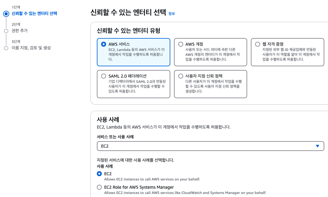 예를 들어 EC2에 연결할 역할을 설정한다면 IAM > 액세스관리 > 역할 순으로 페이지에 접속하여 [역할생성] 버튼을 클릭한다. 아래와 같이 어떤 목적으로 역할을 만들 것인지에 대한 질문이 나오는데 AWS 서비스와 하단에 EC2를 선택하겠다.