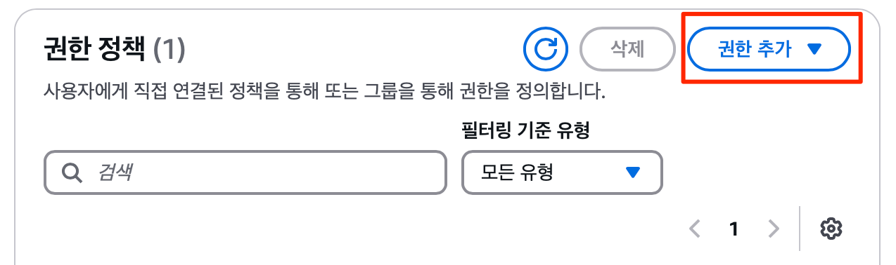 새로 만든 'admin' 사용자 이름을 누르고 들어가면 아무 권한도 없는데 관리자로서의 권한을 주기 위해 상단에 있는 드롭박스를 열어 [권한 추가]를 눌러 이동한 후, [직접 정책 연결] 옵션을 선택한다.