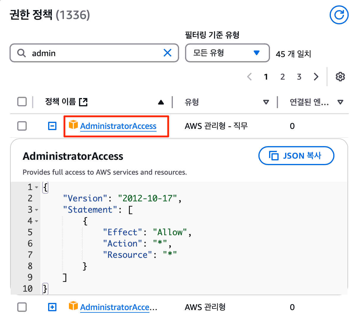 여러 정책들이 나열되는데 이 중에서 [AdministratorAccess] 이름의 정책을 선택하여 설정한다. [+] 버튼을 눌러 세부 내용을 확인해보면 모든 리소스에 대해 모든 액션을 허용한다는 의미의 정책이 설정되어 있음을 알 수 있다.